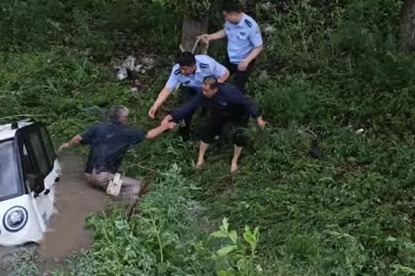 現(xiàn)場,一輛電車側(cè)翻在坑內(nèi)水流中,車輛熄火、人員被困,透過車窗能看到有人揮手呼救。民警耐心安撫被困人員的情緒。救援隊伍兵分兩路,一組民警在過膝的積水中小心翼翼前行,協(xié)助車內(nèi)脫困,另一組民警在路上設(shè)置安全警示標(biāo)識,防止二次事故發(fā)生。由于被困人員所處位置在水域中央,情況復(fù)雜,民警想到拿救援繩進(jìn)行救助,經(jīng)過數(shù)次拋擲,被困人員終于抓住了繩子,民警一點點把被困老人拉上了岸。