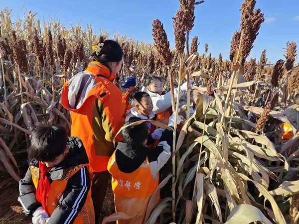 隨后,孩子們來到鶴島農莊參與高粱收割實踐。研學導師詳細講解高粱的種植歷史、生長周期與多元用途,讓大家全面了解糧食生產過程。在古法收割體驗中,孩子們親身體會 “粒粒皆辛苦” 的含義,還共同宣讀《節約宣言》,在橫幅上鄭重簽名,許下節糧承諾。