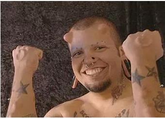 美國有位路易桑切茲的兄臺,為了讓自己看起來像一頭小牛,也是在自己的額頭做功課,愣是移植了兩只“角”,不只如此,他還給自己裝了耳環(huán)和鼻環(huán)。要是“犄角”再長一些點(diǎn),加上一個假頭套,活脫脫就是西游記里跳出來的牛魔王。